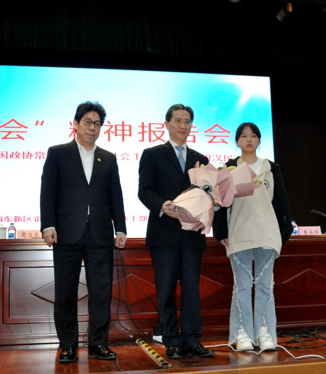 会上有一群特殊的来宾,他们是偏远地区受到教育资助的一群学生,他们品学兼优,但是由于生活的贫困,难以继续学业。是企业家在他们困境时伸出援手。浦东新区企联副主席、剑鑫教育集团董事长奚剑鑫把贫困学生带到位于上海浦东的剑鑫学校,让他们得以继续学业。为表达贫困学生对中华职教社以及浦东新区企联多年来的关怀和资助,现场有学生代表上台为中华职教社主任周汉民献上鲜花,并有优秀学生代表马洁表态发言。